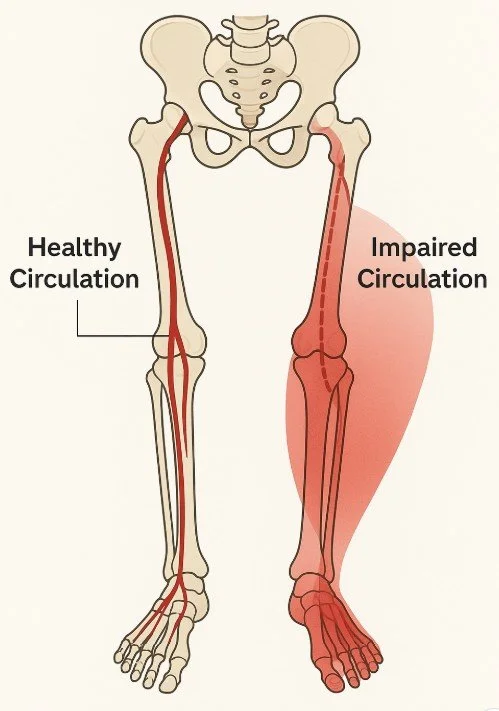 Poor circulation (PAD) narrows arteries and slows healing³.