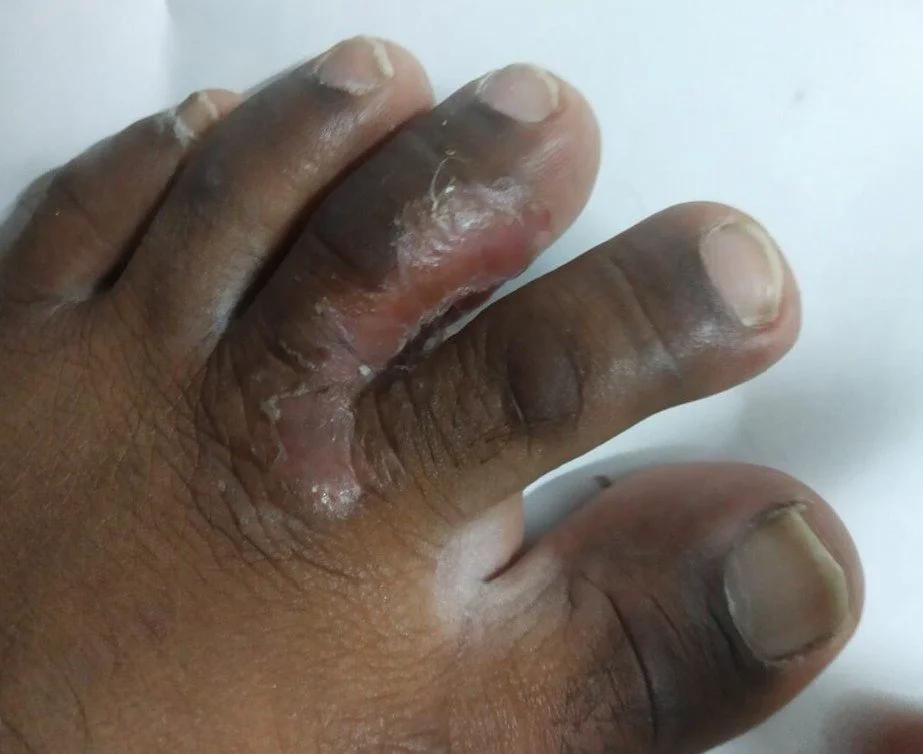 Common appearance of interdigital tinea pedis (athletes’ foot). It is caused by the same fungus that causes nail fungus. It can act as a living reservoir of fungus causing recurrent infection
